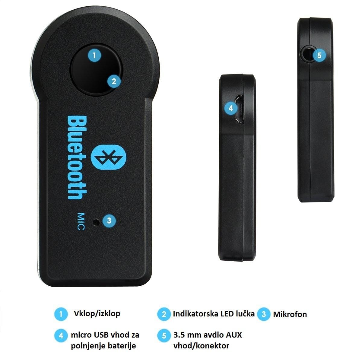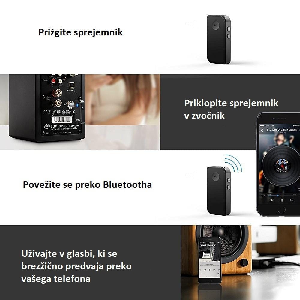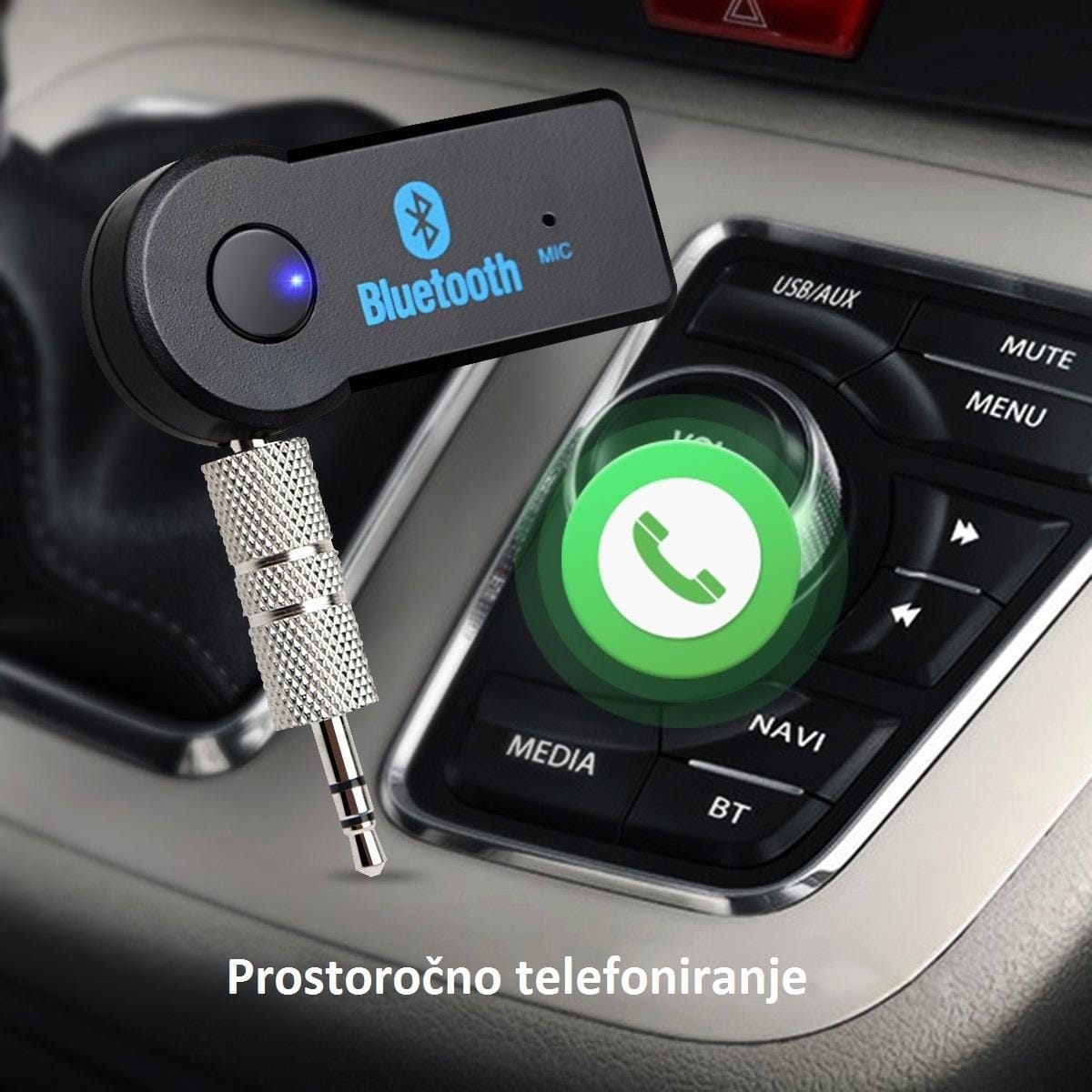 Bluetooth spremnik za slušanje glazbe omogućuje bežično slušanje glazbe pomoću Bluetooth uređaja (pametni telefoni- iPhone, Android ili tablet ) na autoradiju, radiu, ili nekom drugom uređaju koji ima AUX ili LINE-IN priključak (3,5 mm). Izrađen je posebnom tehnologijom koja također omogućuje da preko automobilskog zvučnika spremate pozive s Vašeg pametnog telefona. S pametnim dizajnom, jednostavnim postupkom Vaš zvučnik može postati handsfree Bluetooth zvučnik. Osim toga, moći ćete uživati u kristalno jasnom zvuku vaše glazbe.